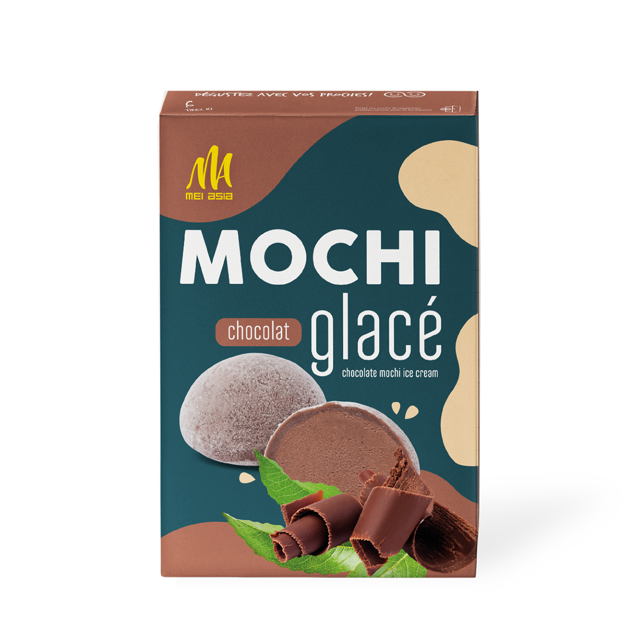 67% ice cream (water, 10% cream (cream, thickener: E407), glucose syrup, sugar, skimmed milk powder, 4% cocoa powder, palm fat, invert glucose syrup, dextrose, emulsifiers: E471, E472b, E477, thickeners: E407, E466, soybean flour, salt), 33% rice dough (water, sugar, 19% glutinous rice flour, potato starch, trehalose, 0,8% cocoa powder).